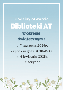 Szanowni Czytelnicy, informujemy o godzinach otwarcia naszej Biblioteki w okresie świątecznym: 1-7 kwietnia 2026r. – czynna w godz. 8.30-15.00, 4-6 kwietnia 2026r…